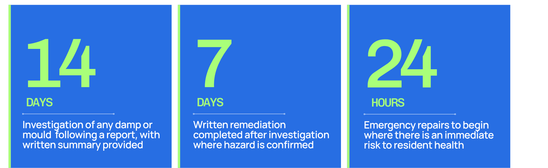 The core obligations under Awaab’s Law require landlords and operators to act within defined timeframes once a damp or mould hazard is reported. The timelines are legal obligations, not targets.