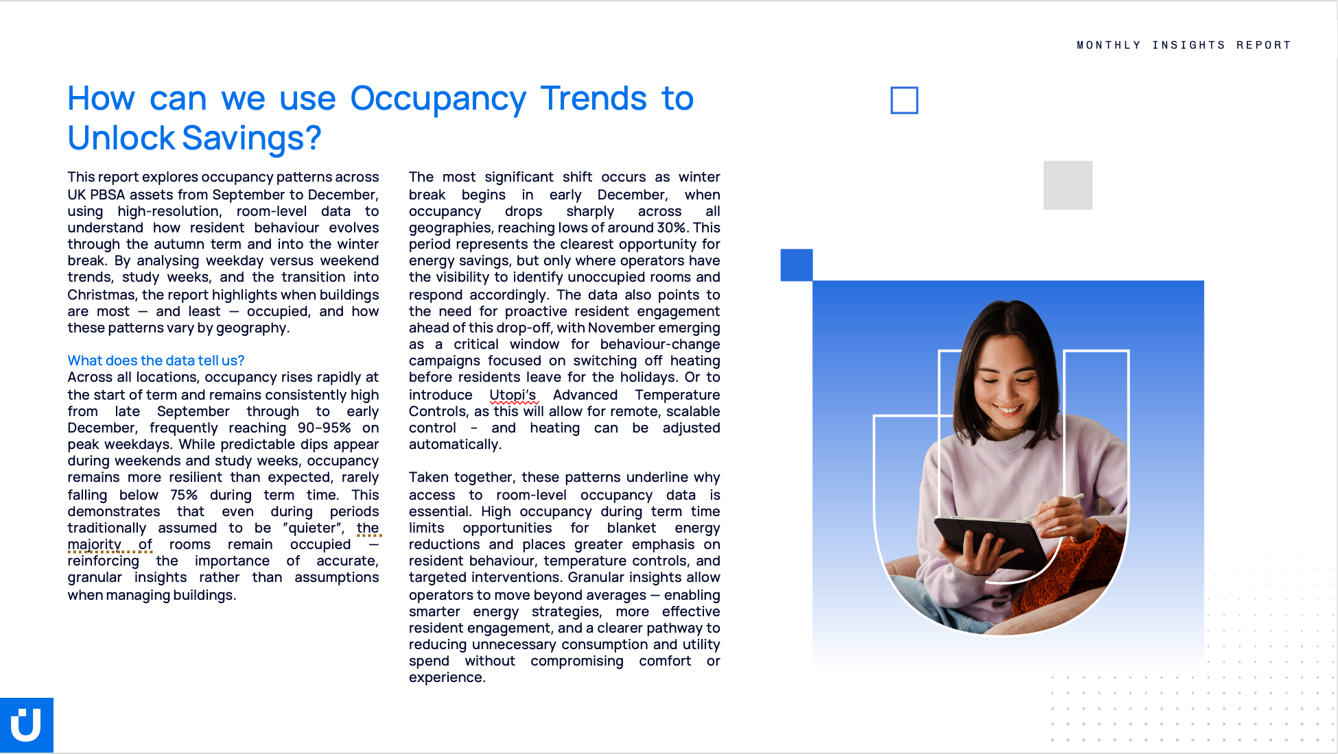 “We talk a lot about granular, room-level insights, and this report showcases why being armed with the right data is so important. Having an understanding of resident behaviours and how residents are living in your assets allows you to build strategies for asset performance optimisation and remove any guess work; while also keeping you informed of other areas like resident welfare and minimising isolation – a hot topic in the PBSA sector right now. ”Falk Bleyl, CTO & Co-Founder at Utopi